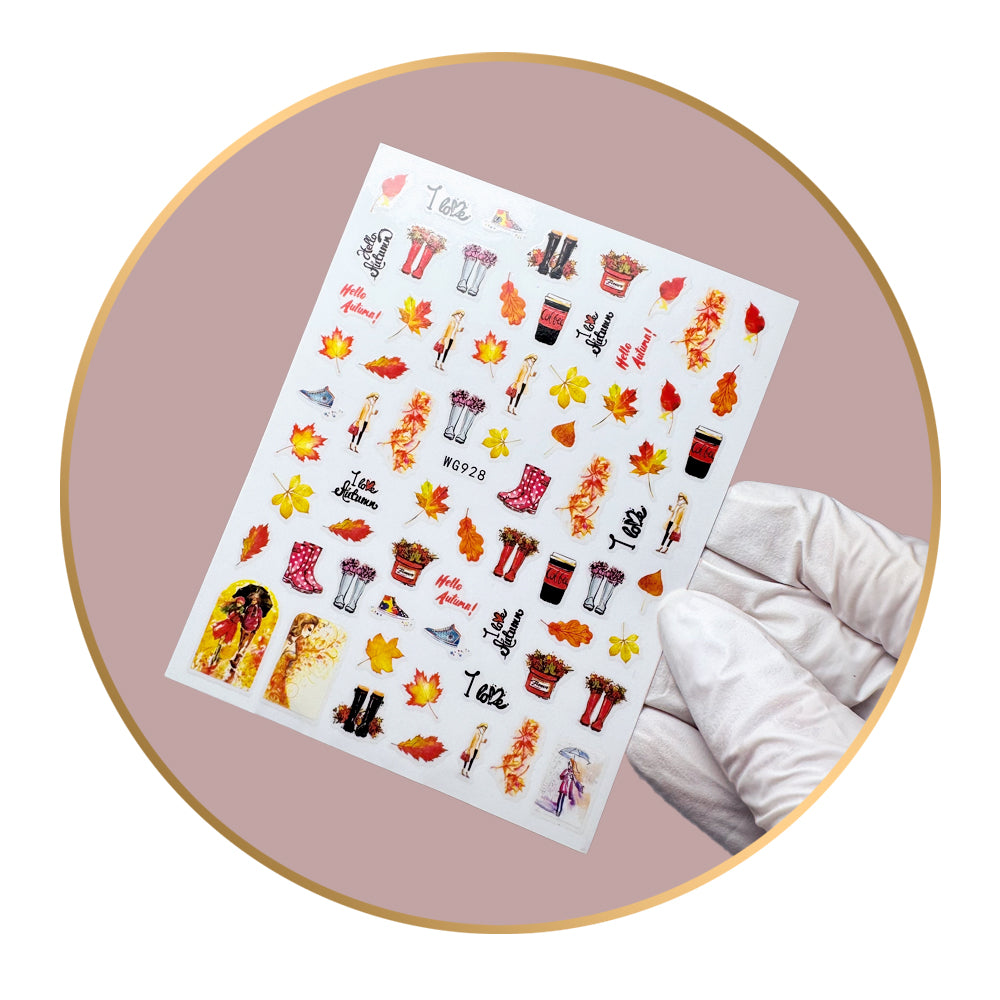 This set contains autumnal designs including leaves and boots in yellows and oranges.