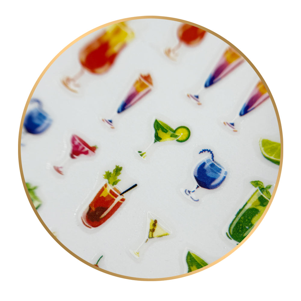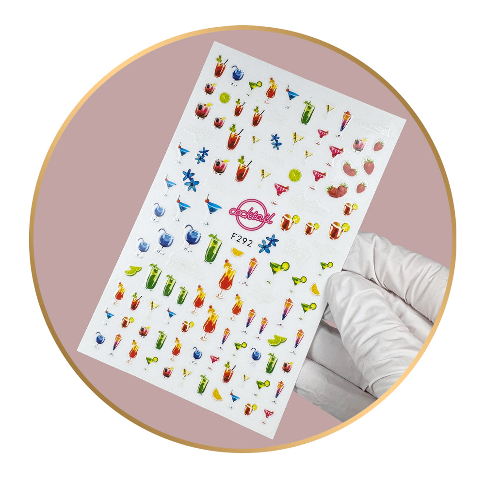 Noriko Ready2Stick stickers can be applied over fully dried nail polish and sealed with a top coat for durability. When used with nail enhancement products, the nail surface should be prepared. If applying to cured gel, cleanse and gently buff the nail. Peel the sticker with tweezers and place it on the nail, ensuring it adheres well. Excess sticker can be trimmed with a file, and the design is finished with a top gel.