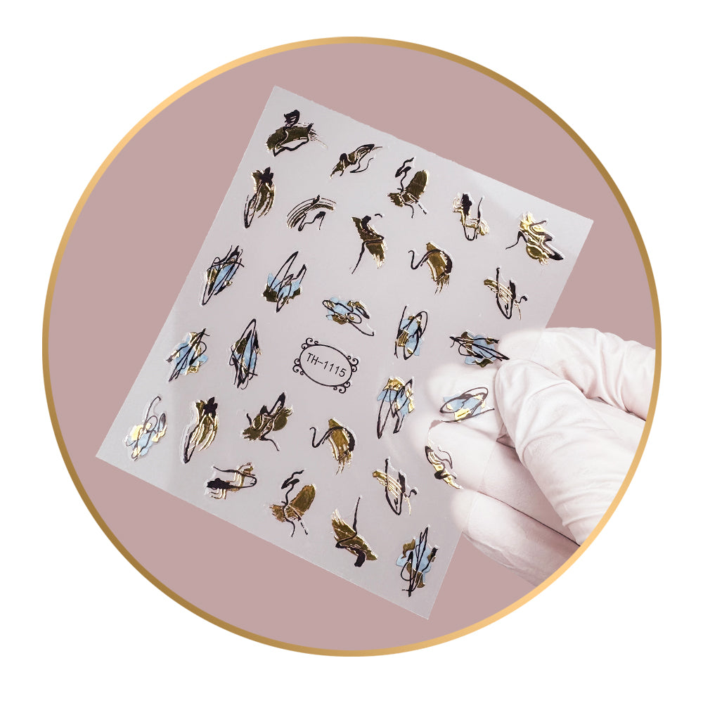 Noriko Ready2Stick stickers can be applied over fully dried nail polish and sealed with a top coat for durability. When used with nail enhancement products, the nail surface should be prepared. If applying to cured gel, cleanse and gently buff the nail. Peel the sticker with tweezers and place it on the nail, ensuring it adheres well. Excess sticker can be trimmed with a file, and the design is finished with a top gel.